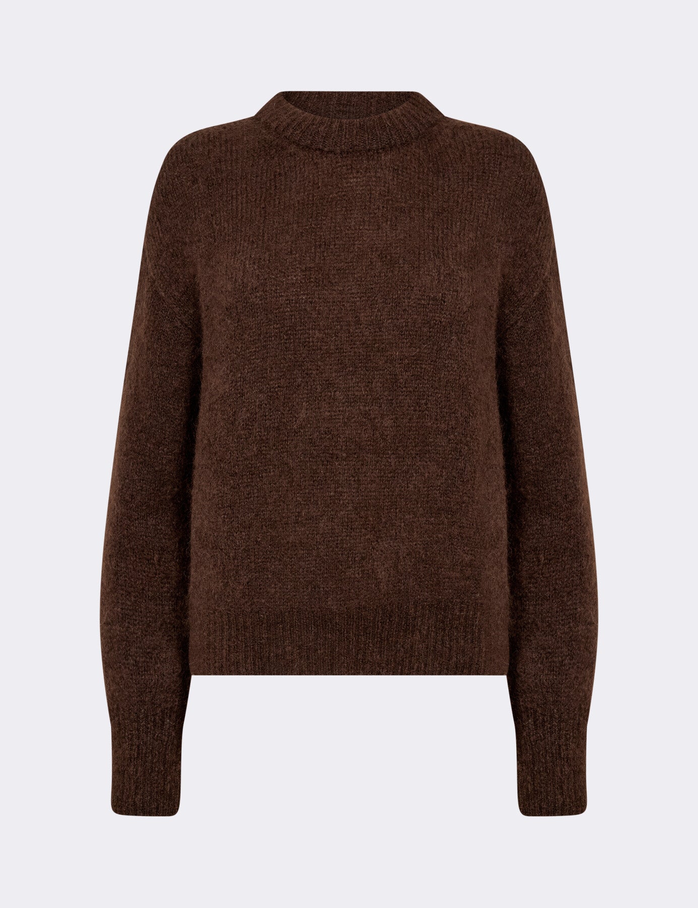 LR-NOREEN 1 Pullover består av 53% mohair, 45% polyamid och 2% elastan, med ribbad rund hals och långa ärmar. Den mjuka, texturerade ytan ger en sofistikerad känsla som passar både med skräddarsydda byxor och jeans för olika tillfällen.